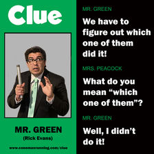 Based on the iconic 1985 Paramount movie which was inspired by the classic Hasbro board game, Clue is a hilarious farce-meets-murder mystery. The tale begins at a remote mansion, where six mysterious guests assemble for an unusual dinner party where murder and blackmail are on the menu. When their host turns up dead, they all become suspects. Led by Wadsworth the butler, Miss Scarlet, Professor Plum, Mrs. White, Mr. Green, Mrs. Peacock and Colonel Mustard race to find the killer as the body count stacks up. Clue is the comedy whodunit that will leave both cult fans and newcomers in stitches as they try to figure out... WHO did it, WHERE, and with WHAT!